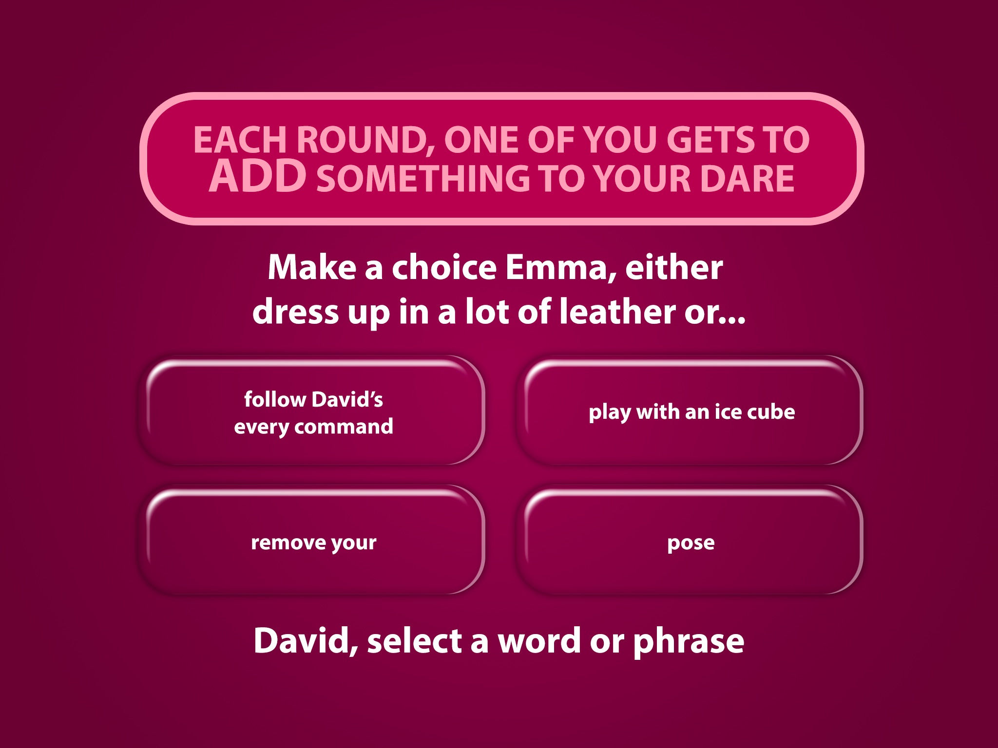 • When you’ve finished creating a dare you must act it out before you’re allowed to move on to the next round - where you’ll start building a completely new challenge.