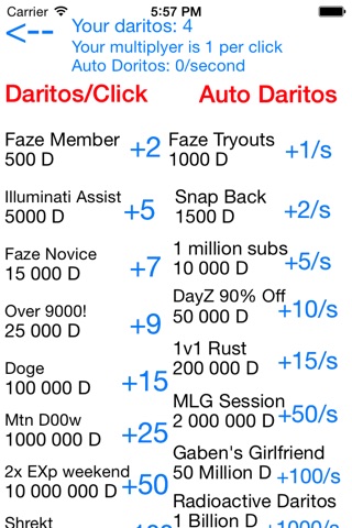 Tap the darito in the middle of the screen in order to gain daritos. Spend daritos on upgrades. With the upgrades, you can either get more daritos per click or more auto-daritos per second. Some of the upgrades include a Snap Back, Faze Clan Membership or even Spoderman! How many daritos can you get?