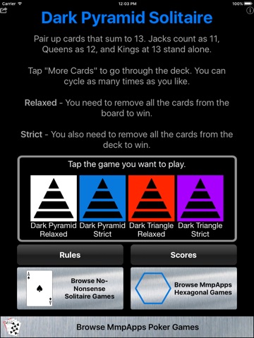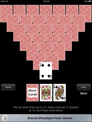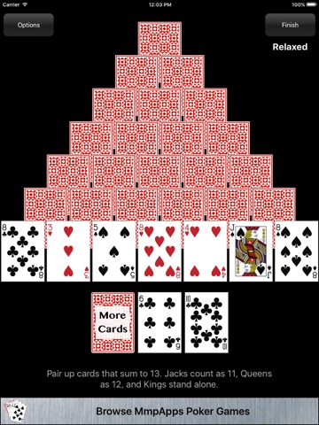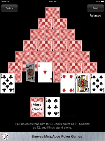 Pair up cards that sum to 13 in an attempt to clear the board. Jacks count as 11, Queens as 12, and Kings at 13 stand alone. The diabolical thing about this game is that the cards in the pyramid are hidden increasing the difficulty over traditional Pyramid.