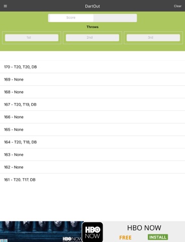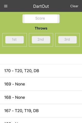 This application will help you in those critical moments at the end of your 01 game. No need to squint at an out chart. Enter the current score, and you will be given the ideal out for that shot. If you miss, enter your throw and the out is immediately updated for you. An excellent application for players on dart leagues who struggle with closing the game.
