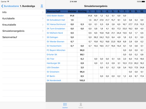 - Ausgehend von den aktuellen Tabellen berechnet es 100.000 mögliche Saison-Verläufe.