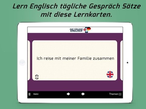 Wenn Sie in einem Urlaub sind, brauchen Sie diese App zu sprechen. Es gibt viele lernkarten für das tägliche Englisch. Das ist nicht nur für die Reise. Wenn du möchtest English lernen, hilft “Das tägliche Englisch” dir, um zu sprechen.