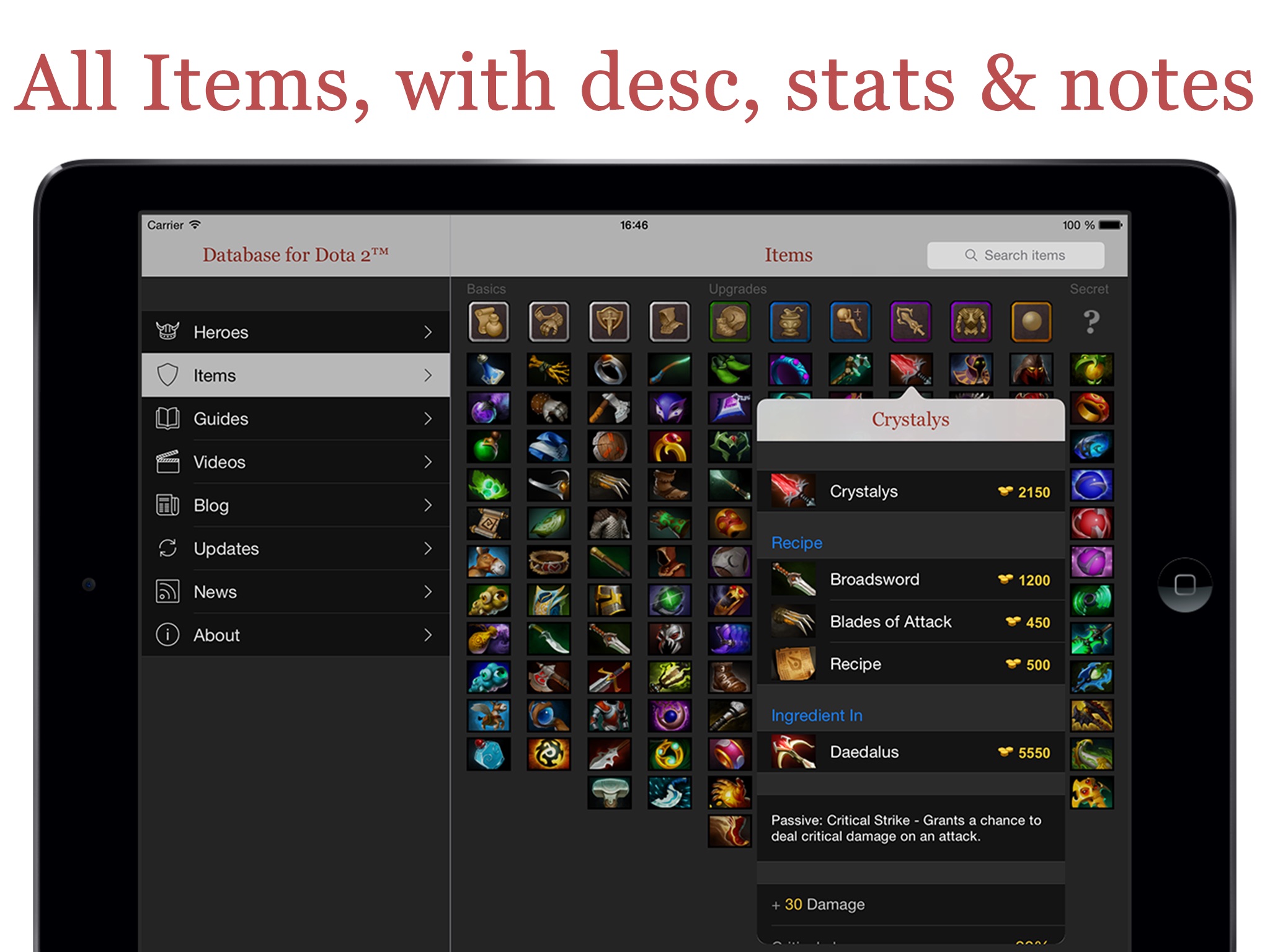 Great app for DotA 2; has all the Heroes, all the abilities, and even demonstrations of the abilities as well as plentiful, and helpful guides, including "how to feed on dota" lol BUT... The videos dont go into landscape, and under the video tab, THE VIDEO DONT WORK AT ALL!!!!!!! Other than that though, its not bad at all.