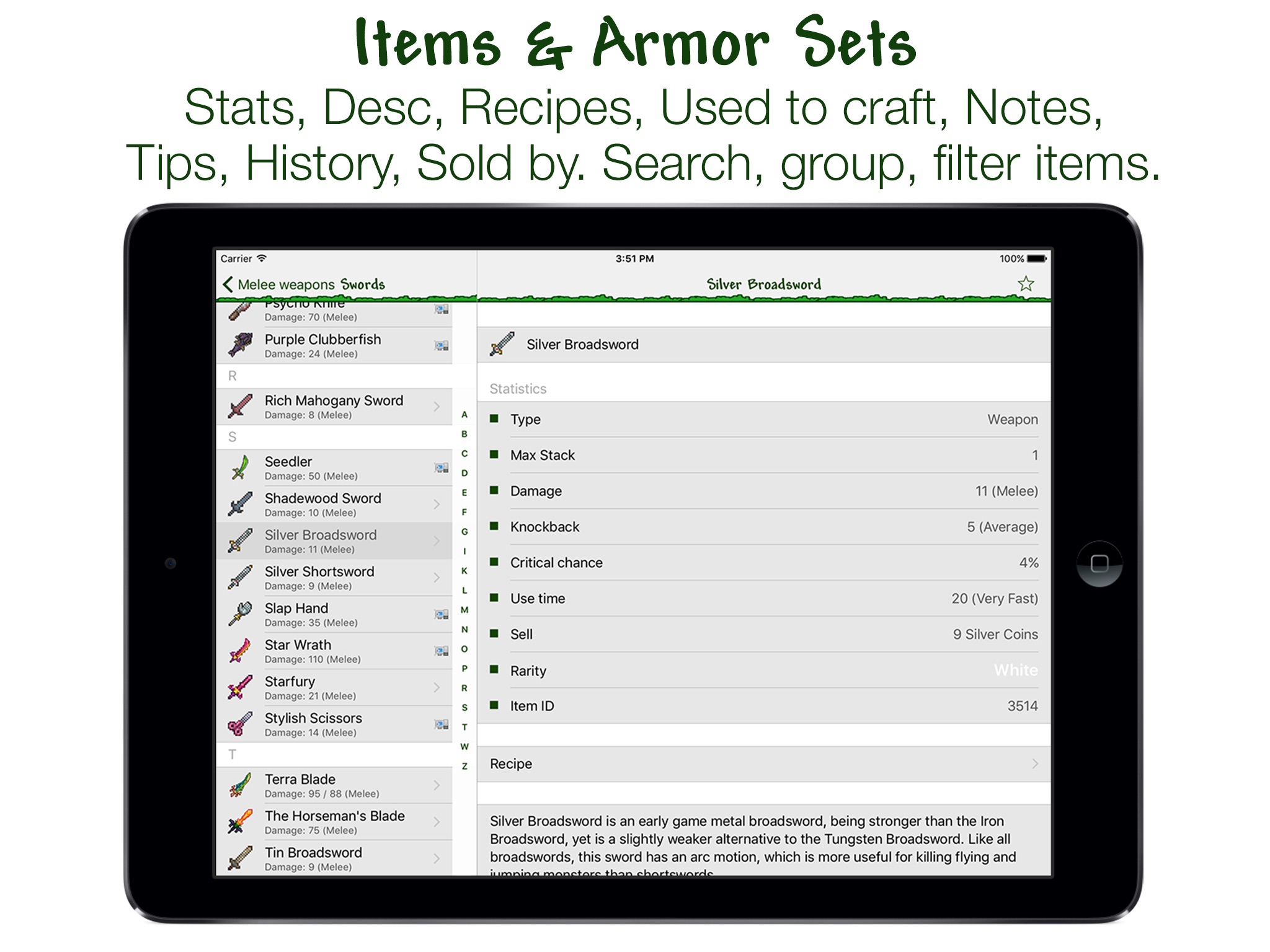 Complete list off all items of the game. Detailed info for each item: stats, desc, recipe (or multiple recipes), used to craft items, drop from enemies, notes, tips, history etc. You can browse all items or grouped by categories like Weapons - Melee weapons - Swords, or craftable items, or items grouped by patch.