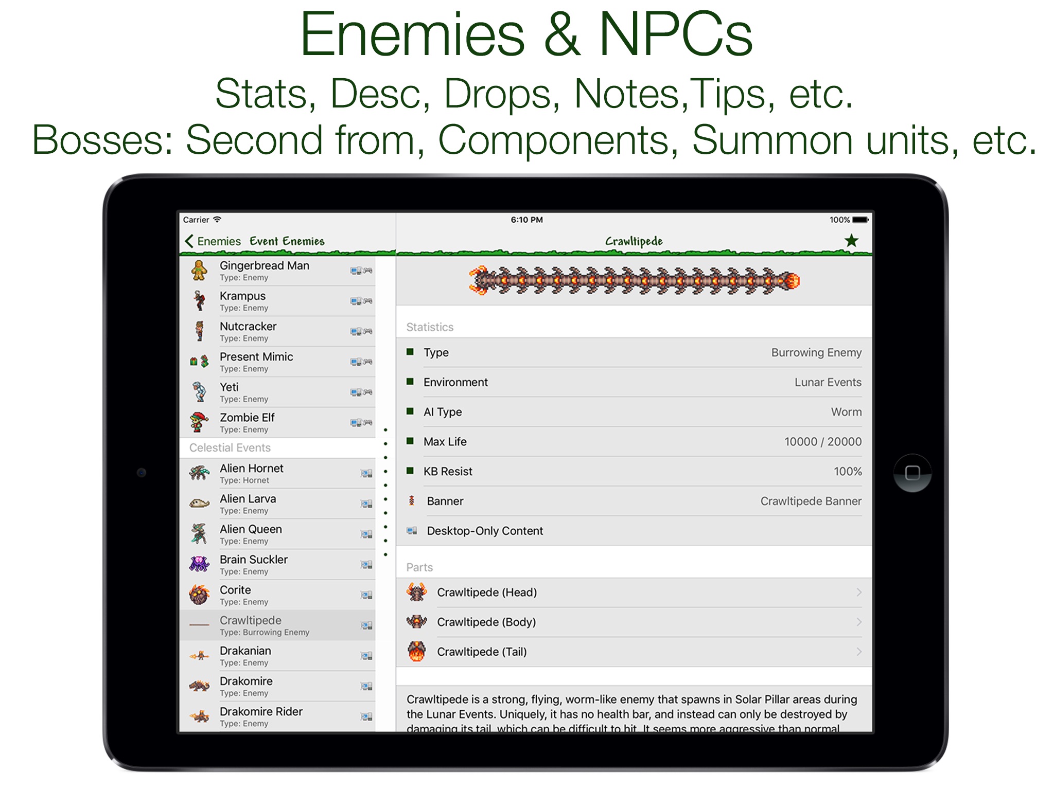 List off all enemies divided by categories: Pre-hardmode, hardmode, events enemies, bosses and event bosses. Detailed info for each enemy: stats, desc, drop, notes, tips, etc. Additional for bosses: parts (stats and drop for each part), second phase, summoned minions, strategy guide.