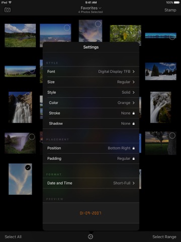 ◦ Easily select photos from your library to stamp — select each individually, swipe to select, select a range, or select all photos in an album