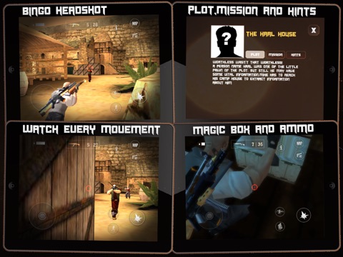 - It also features silent and clean attack. Knife attack your enemy and kill him silently. Throw coins to distract enemies. Staying undetected to complete missions is vital. Each mission features different area and different challenges. Each mission features different clues. Use your tactical and shootings abilities to complete them.