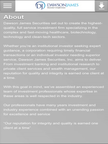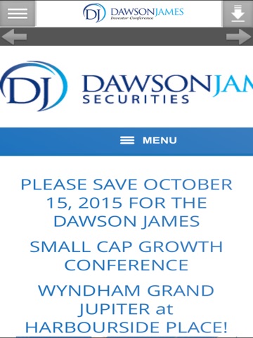 Dawson James Investor Conference Mobile App. This mobile app allows attendees to receive important information about the conference. These include items such as: Schedules, Info, hotel, attendees, sponsors, location, directions ect.