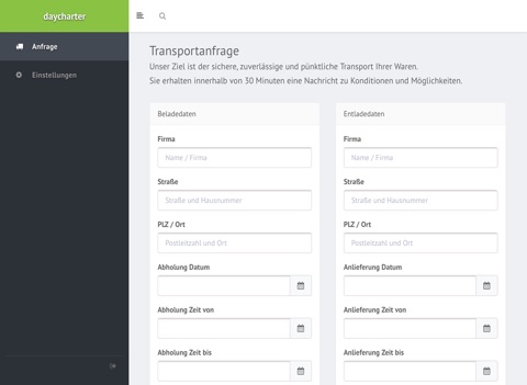 App zur Anfrage von Speditionsdienstleitungen. Detailierte Informationen entnehmen Sie bitte der Seite www.daycharter.de