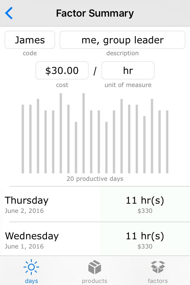 Productivity Calculator uses the daily quantities from each of your production cost factors to give you better idea of how things went for that day. Perhaps things could be improved for tomorrow?