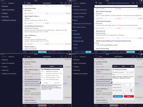 ► Annual - Great for annually recurring events, just enter the details once and days will always remember: Birthdays, Anniversaries, Name days, Death dates, Public Holidays, Historic Events, National Celebrations