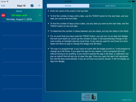 Works with Apple Watch so you can see how many days until the event in a complication, as a glance or as an app.