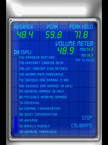 Weve included some useful statistics about the measured volumes, including Average, Peak, Peak Hold, current dB level, maximum, and minimum values. These can all be quickly reset by tapping the "Reset" button, or they can be "frozen" by tapping Start/Stop.