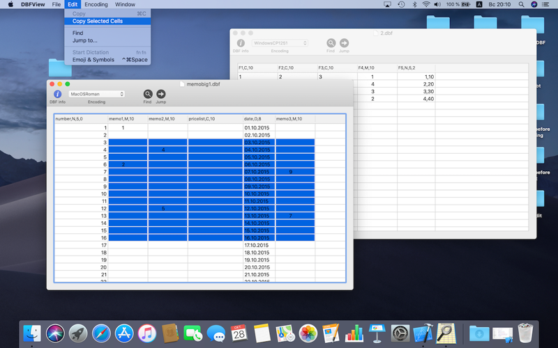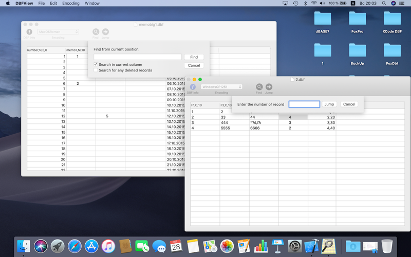 DBFView gives you the opportunity to apply eighteen kinds of encoding and has functions of searching within the file and copying of block of cells to clipboard. Added function of opening files of CIECA EMS standard (Extensions: ENV/VEH/TTL/STL/AD1/AD2/PFT/PFL/PFP/PFM/PFO/LIN), Visual FoxPro (limited use for memo fields and special types of fields) and dBASE 7 (limited use for special types of fields).