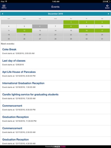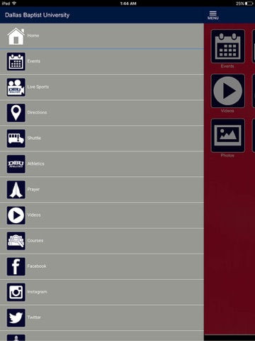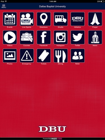 Official app of Dallas Baptist University. Services include Videos, Photo Gallery, DBU social media feeds from Facebook, Twitter and Instagram; Course search, Prayer requests submission form, News, Athletics Events, Directions to various campus locations, DBU Shuttle tracker and more.