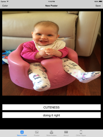 Once all the fields are entered you need to tap the “Save” button on the top right of the view. You will then be shown your new poster in the Poster view so that you can share with face book, twitter, Email it, save it to your Photo Library or Rate the Poster.