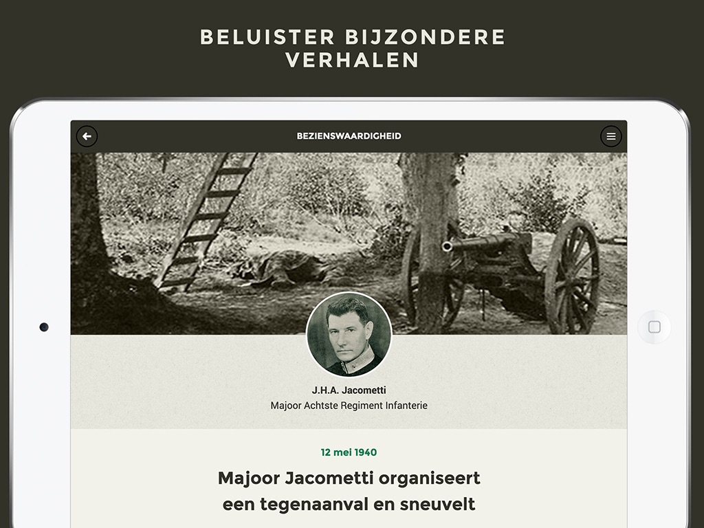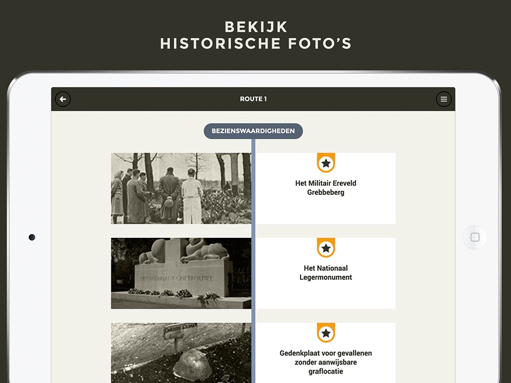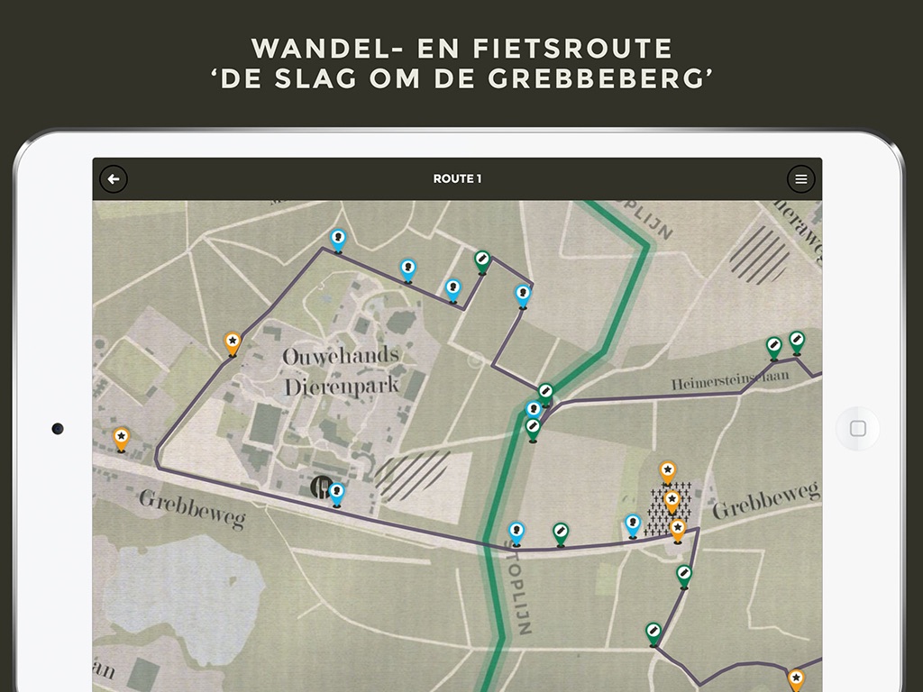 Deze app neemt je - aan de hand van twee routes - op een interactieve wijze mee langs belangrijke plekken van de strijd. Het vertelt het persoonlijk verhaal van de soldaten aan de hand van luisterverhalen en toont de slag en de sporen van de strijd in woord en beeld.