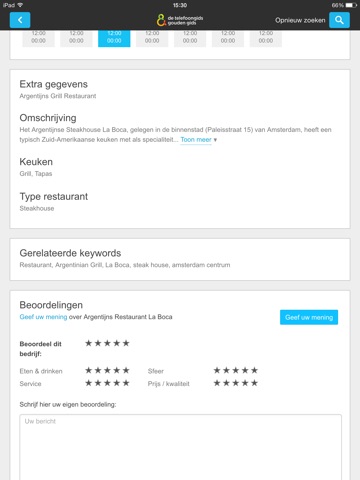 - Resultaten zijn compleet met gedetailleerde bedrijfsinformatie, zoals openingstijden en specialiteiten