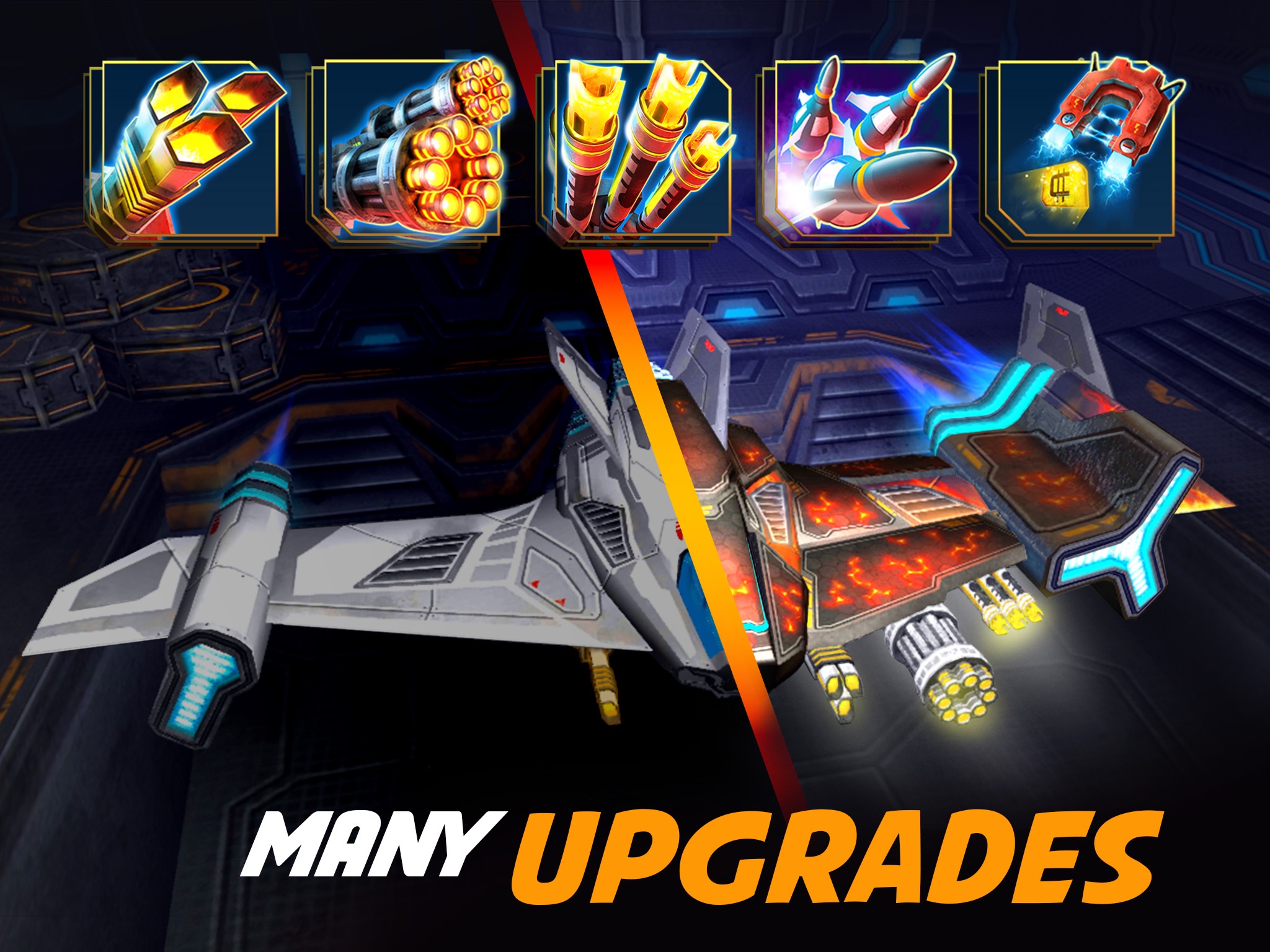 Foes are getting stronger in each stage, so in order to blast em from each sector of the galaxy you need to upgrade your arsenal of weapons and defences. To protect yourself against their deadly projectiles the hangar is full of upgrades for your vessel of ultimate destruction.