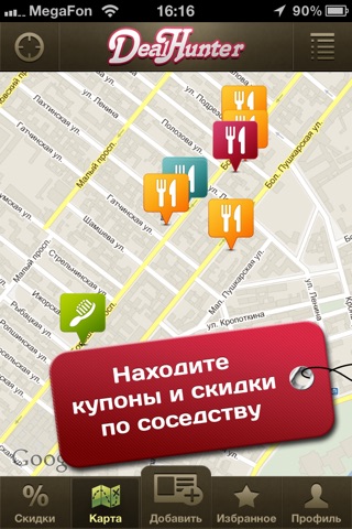 DealHunter – удобный поиск по карте, ближайшие выгодные предложения, фильтр категорий.