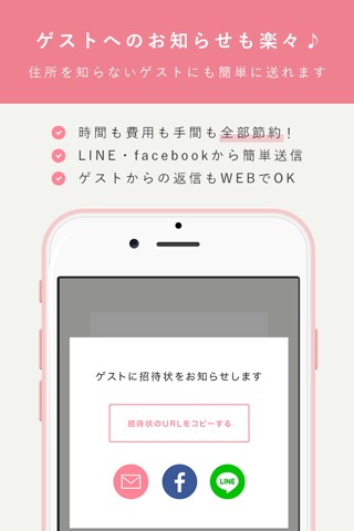 招待状のURLは、LINEやfacebookで簡単に共有することができます。