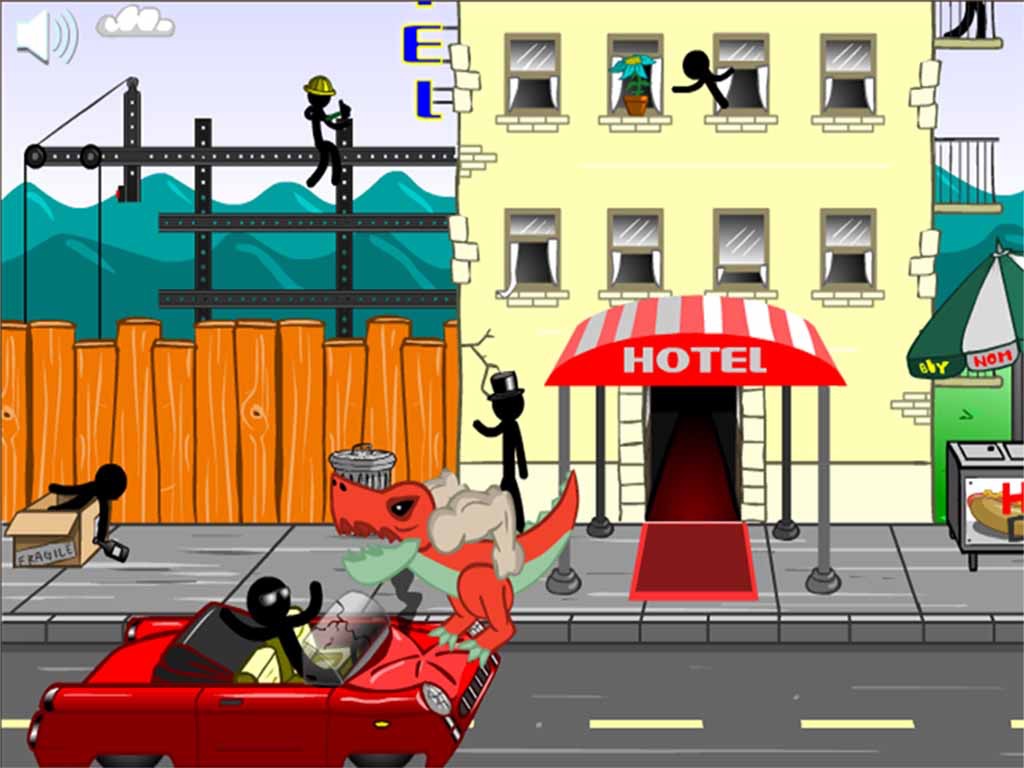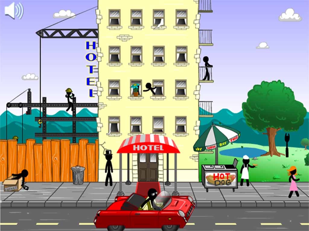 1 Click,8 Sticks, Can you kill them all? Ahh what a beautiful day in this fine city neighborhood. Cars buzzing by, guys exercising by a pond, and hot dog vender open for business. Now its up to you to end everyones life in tragic ways! Try to find ways to cause chain reactions that result in everyones death! You only get 1 click, so use it wisely! Have fun!