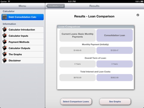 * Input any number of current loans and see the total of your debt, your overall monthly payments and what interest you will incur through the life of the loans.