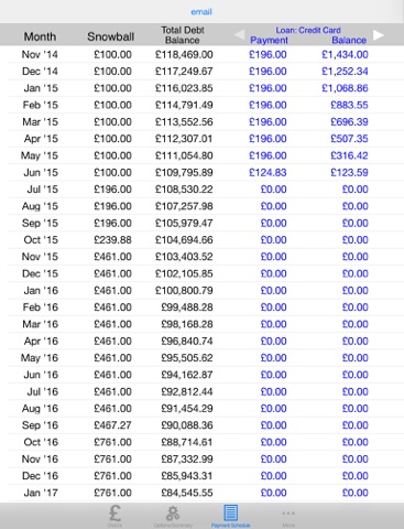 •Detailed Payment Schedule spreadsheet, showing effects of applying snowball payments to individual debts.