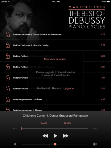 The Best of Debussy: Piano Cycles collects the Composer’s most popular and best-known piano works in a simple, easy to use iPhone and iPad optimized interface. 13 tracks of the greatest performers from one of the greatest masters of music history.