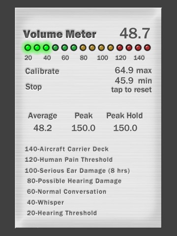 Weve included some useful statistics about the measured volumes, including Average, Peak, Peak Hold, current dB level, maximum, and minimum values. These can all be quickly reset by tapping the "tap to reset" button, or they can be "frozen" by tapping Stop.