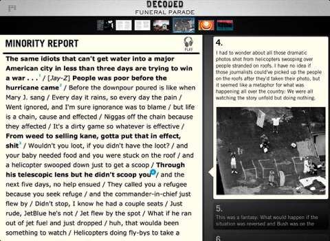 ** You can also listen to Jay-Z’s songs as you scroll and click through the lyrics (requires songs to be in your iTunes library). Preview any songs you don’t own and then click to buy.