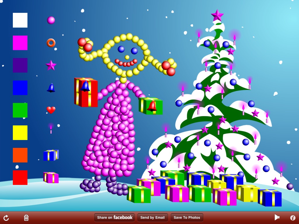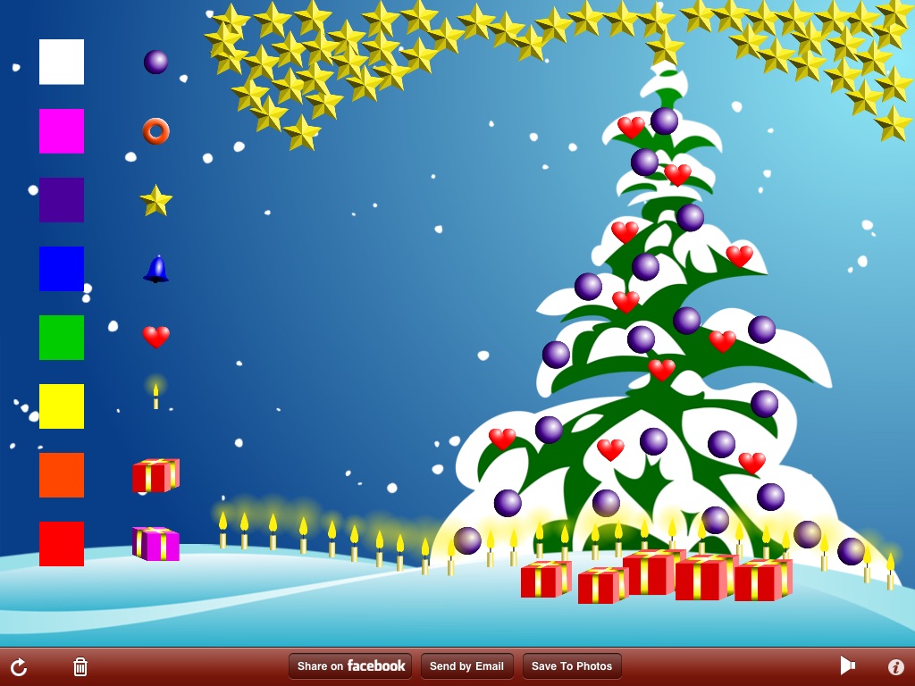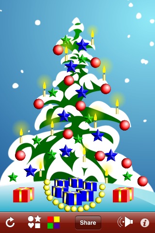 App includes a tree, differently shaped decorations; ball, ring, star, bell, heart, candle and gifts, variety of colors that can be applied to each decoration and arbitrary size for individual decorations from tiny to XXL. User’s taps, drags and pinches are accompanied by nice sound effects. Creative process is enhanced with soothing snowflakes animation and violin Jingle Bells background music.
