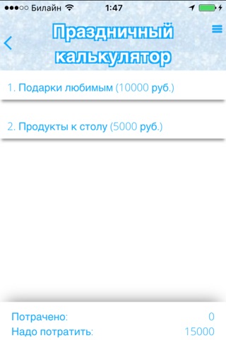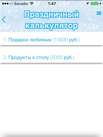 В приложении есть Новогодний калькулятор и органайзер, которые помогут вам спланировать список Новогодних дел и рассчитать бюджет праздника.