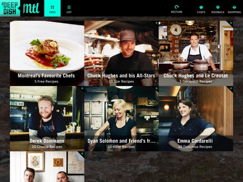 Cook and eat like the pros! DeepDishMTL features over 50 killer recipes from 6 of Montréals top chefs. Youll get 5 FREE RECIPES to start, and the app is chock full of chef secrets, tips and tricks of the trade... not to mention gorgeous step-by-step photography.