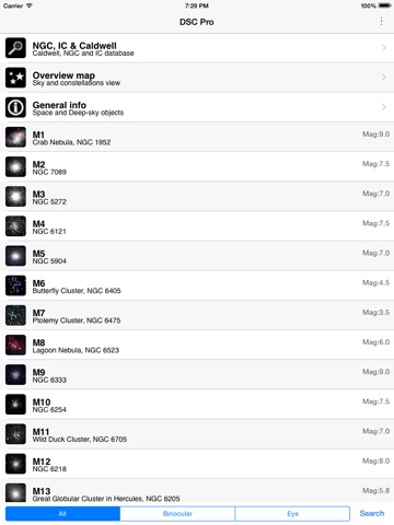 Deep Sky Companion Pro contains information on more than 100 popular and beautiful objects, such as star clusters, nebulae, and galaxies. On each object, you can get detailed information, its image and search map. All of these objects can be observed with an amateur telescope, the majority of the presented objects can be seen with binoculars, and the most interesting ones are visible with a naked eye. Deep Sky Companion Pro also makes possible to quickly find a required object, searching by name, constellation, or tool used for observing the object.