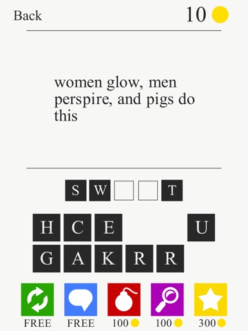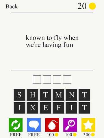 Everything costs money for "coins", "hints". Too easy. Common phrases that lead you to the word. Im not in kindergarten.