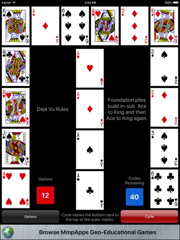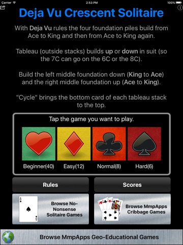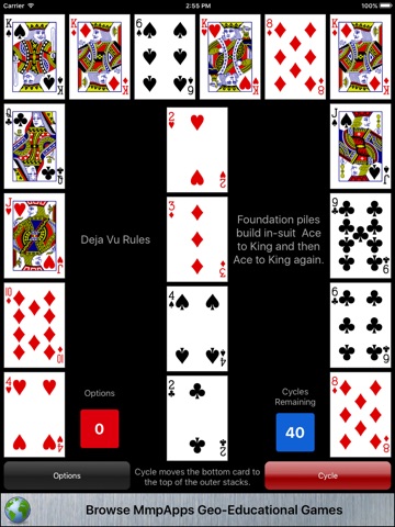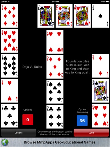 A more challenging version of the popular Crescent Solitaire. With Deja Vu rules rather than having eight foundation piles you only have four (one per suit). Those foundation piles build from Ace to King and then again from Ace to King.