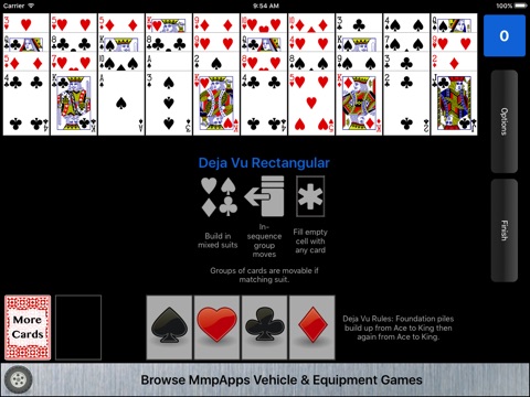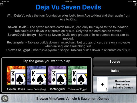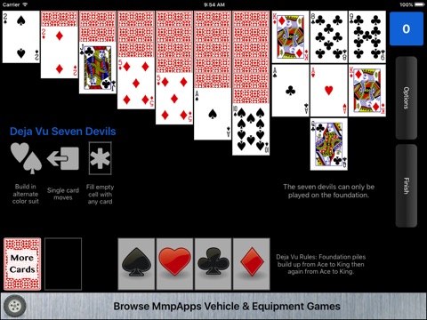 An even more fiendish version of Seven Devils Solitaire. With Deja Vu rules rather than having eight foundation piles you only have four (one per suit). Those foundation piles build from Ace to King and then again from Ace to King.