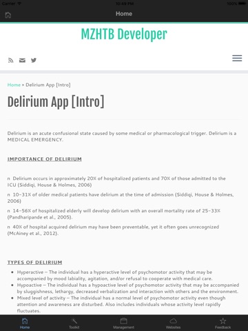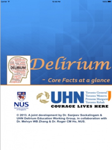 This application is a joint collaboration between the Department of Emergency Medicine, NUHS with Dr Melvyn WB Zhang and Dr Roger CM Ho. This application serves to provide residents and trainee with up to date information to help them in the recognition of delirium as well as in the provision of appropriate treatment for delirium.