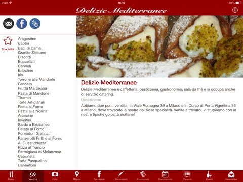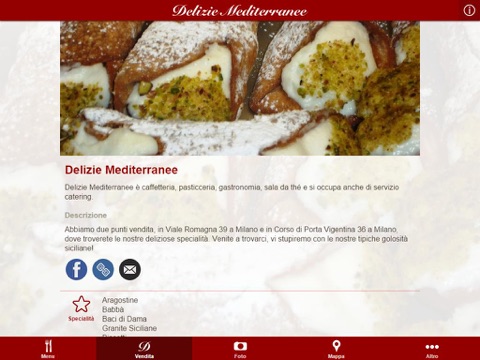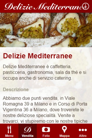 Delizie Mediterranee è caffetteria, pasticceria, gastronomia, sala da thé e si occupa anche di servizio catering. Abbiamo due punti vendita, in Viale Romagna 39 a Milano e in Corso di Porta Vigentina 36 a Milano, dove troverete le nostre deliziose specialità. Venite a trovarci, vi stupiremo con le nostre tipiche golosità siciliane!