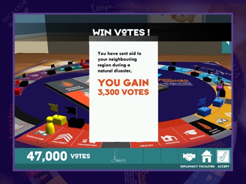 You are playing for Votes, and Votes mean Power. So will you gain Votes through co-operation? Votes can be lost as well as won. Will an economic collapse take away all your votes, or will a natural disaster wipe out all your developments?