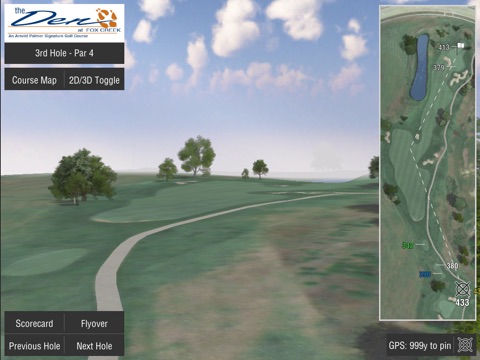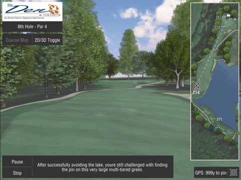Other amenities include an extremely large practice putting green, a large practice chipping green (with practice sand bunker) and a very large grass driving range with several target greens. A full-line Golf Shop offers golf equipment and apparel at discount prices. The Den at Fox Creek has become the host golf course for the Illinois High School Associations Class AA Boys State Championships. Mr. Palmer himself shot 74 during his Grand Opening Round. Can you beat it?