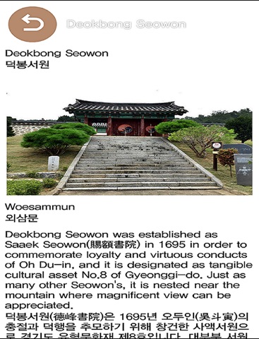 Deokbong Seowon is a virtual reality application to appreciate cultural heritage of Gyeonggi province, Korea.