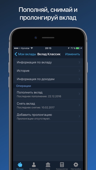 После расчета графика начислений процентов пользователь получает доступ к детальной информации по депозиту. При необходимости есть возможность изменить процентную ставку в середине срока. А по окончании срока депозита — пролонгировать его.