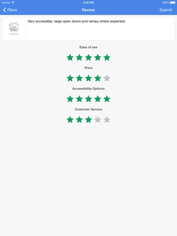 An app that allows users to review and rate any facility based on their experiences in regards to accessibility.