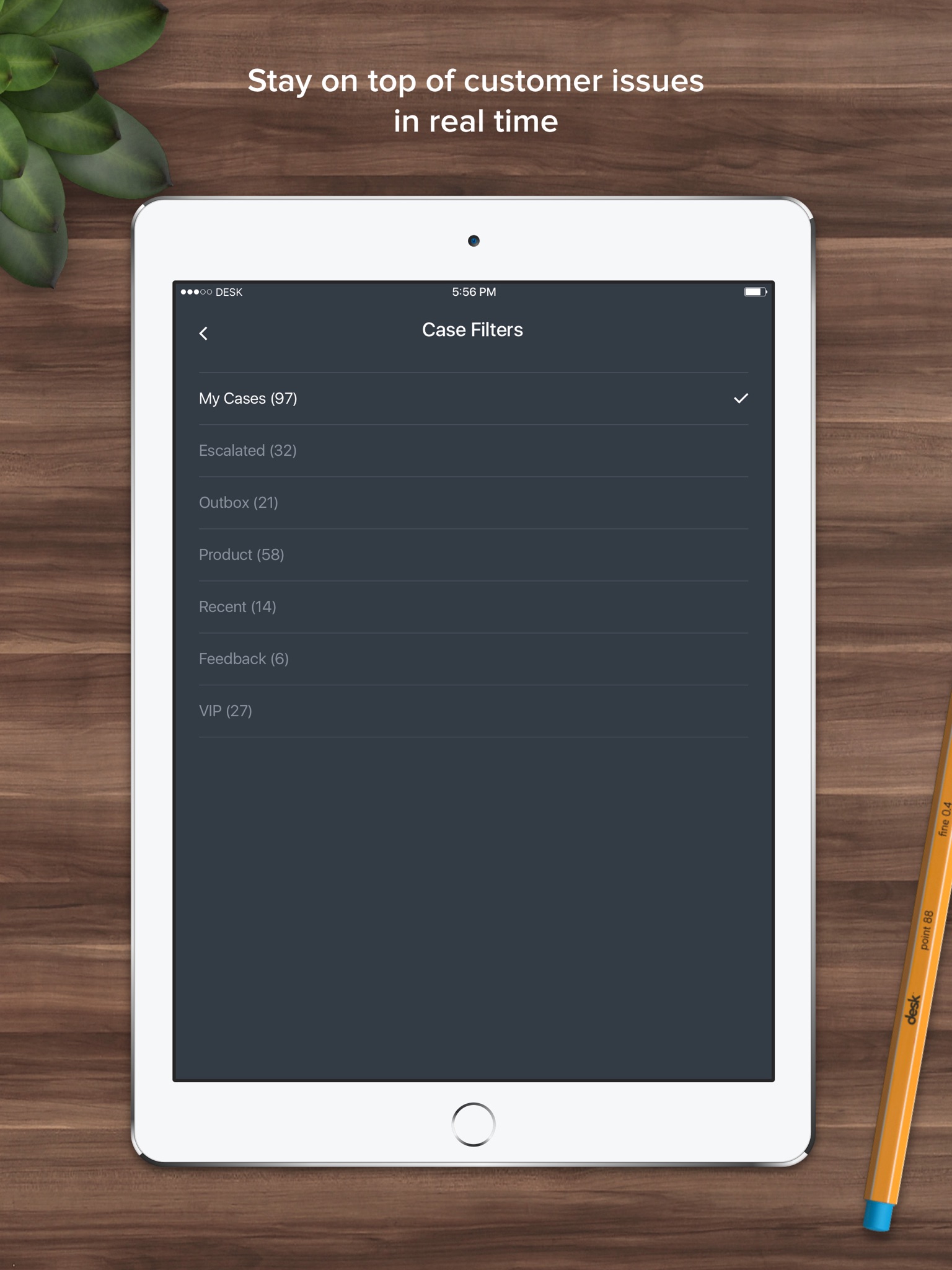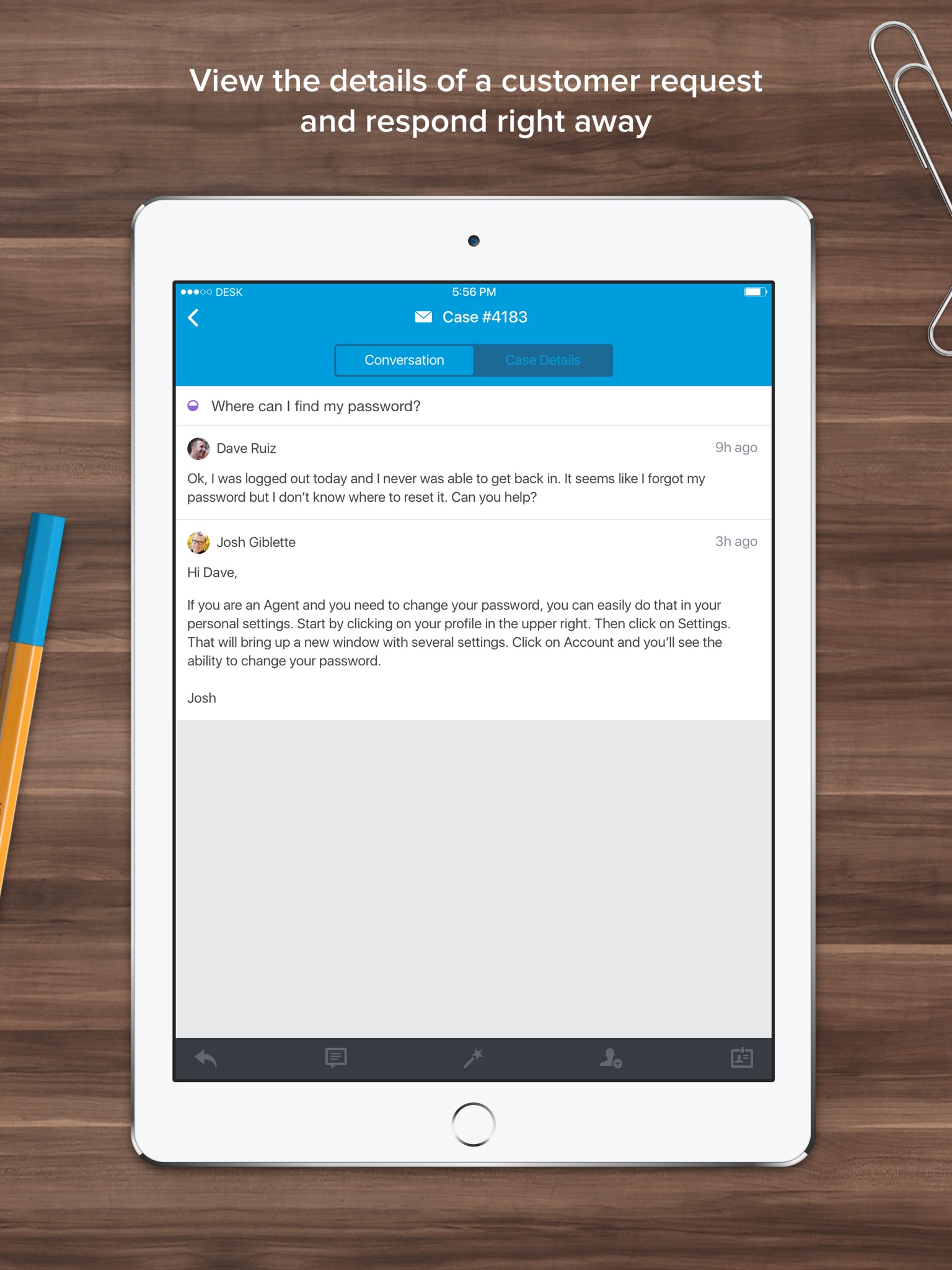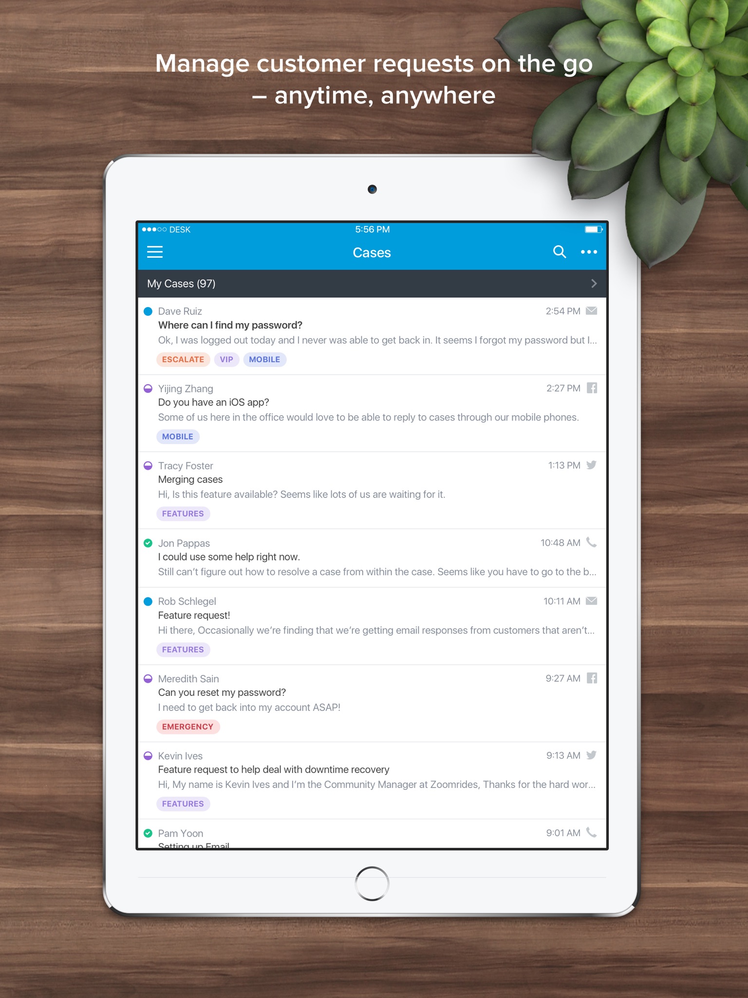 Whether youre on the road or just in the conference room, the Desk app will help you stay on top of customer issues, collaborate with your team, and track and respond to cases. Its that easy and its always safe and secure.