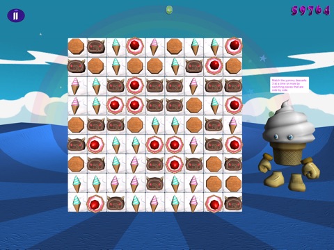 Are you ready for one of the sweetest Match 3 games ever made?!? In "Dessert Storm", you switch desserts in order to match lines of three or more. By doing so, the desserts subsequently disappear, and other desserts will form. Clear a dessert in every location on the board before the time runs out to win. The whole time you play an adorable little ice cream man is cheering you along.