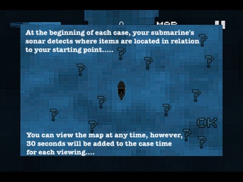 *Your submarine detects most of the items in the ocean at the beginning of the case and lays it out on a map. You can view the map at anytime, but there will be 30 seconds added to your case time with each use.