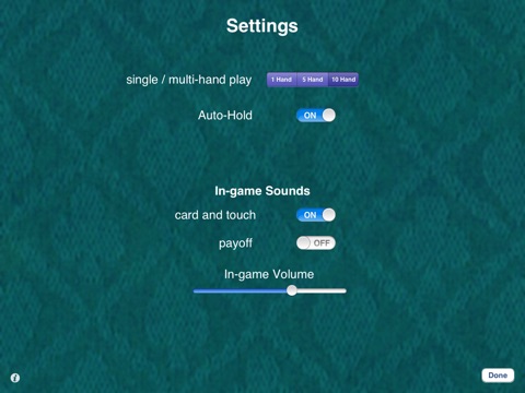 Use the Settings page to change the volume of in-game sounds or turn them off without affecting your music. Some players like to turn off the "payoff" sound to really speed up the game play!