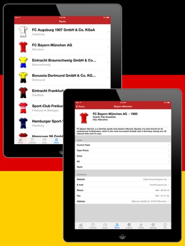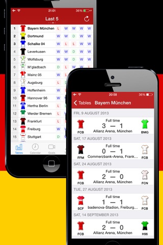 Using "Deutsche Fußball History 2012-2013" you also get an immediate access to the Tournament table, Schedule, Teams, Events in Matches, News and Statistics.